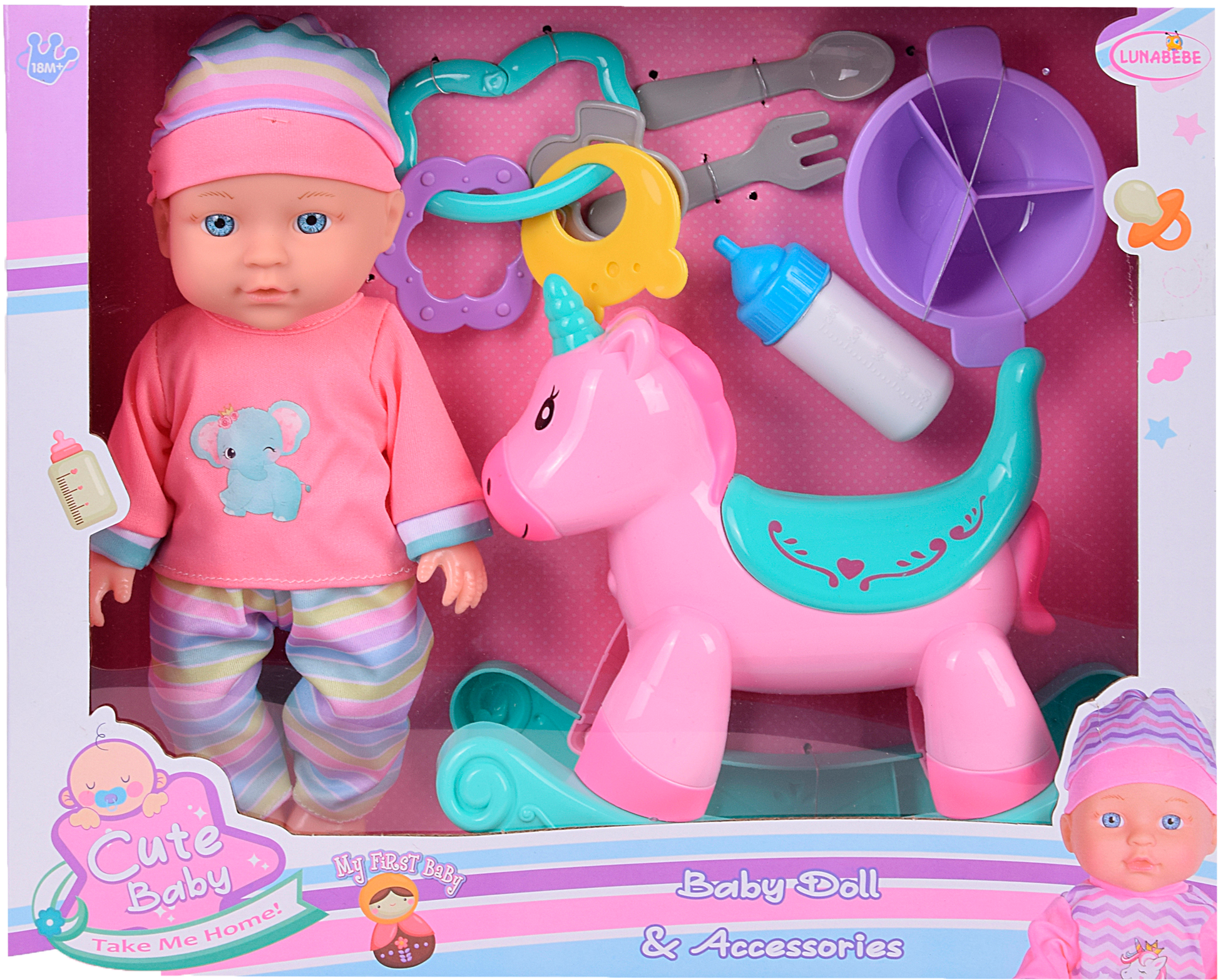 A Boneca 30 cm c/ Unicórnio e Acessórios é o conjunto perfeito para brincadeiras cheias de imaginação. A boneca vem vestida com roupa colorida e macia, e inclui um adorável unicórnio de baloiço, ideal para momentos de diversão e carinho.