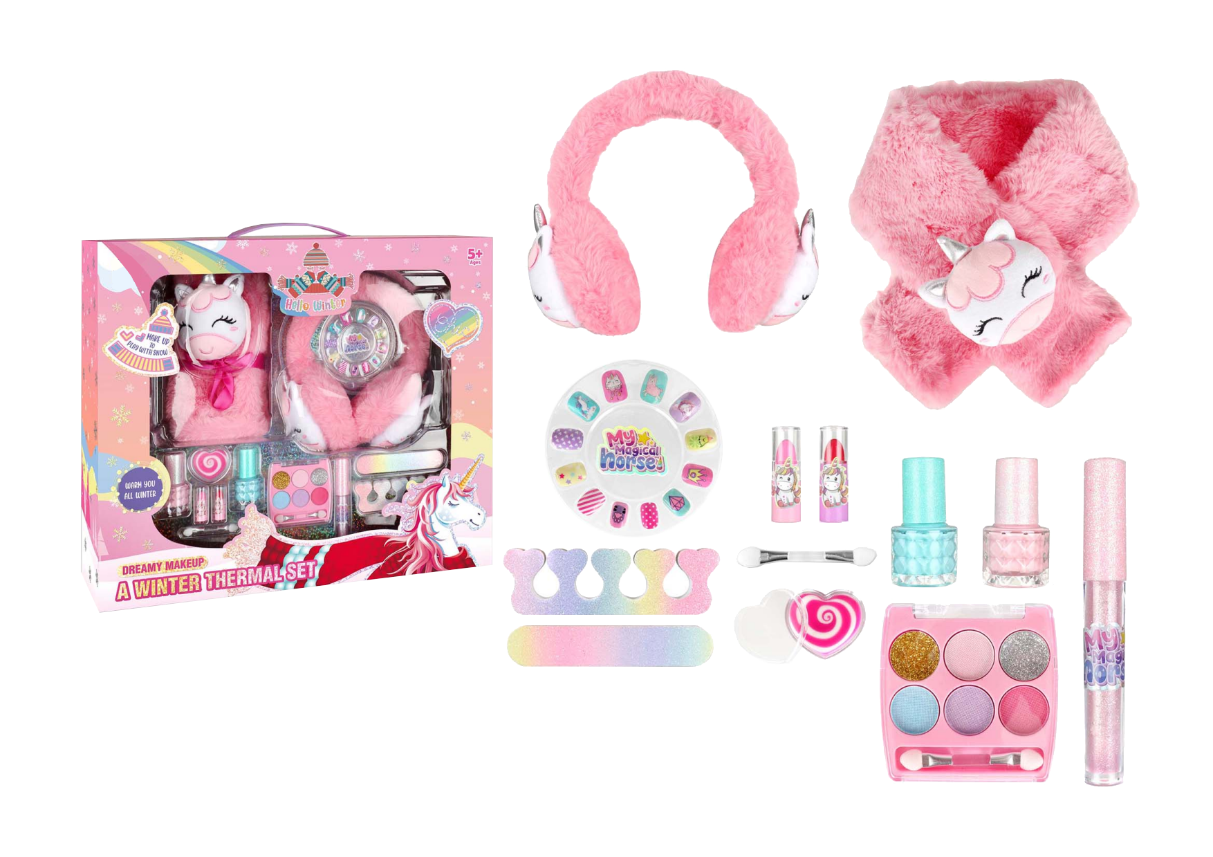 Inclui acessórios super-fofos como protetores de orelha, cachecol felpudo, maquilhagem infantil segura, unhas decorativas, acessórios shimmer e muito mais, tudo com temática de unicórnio.