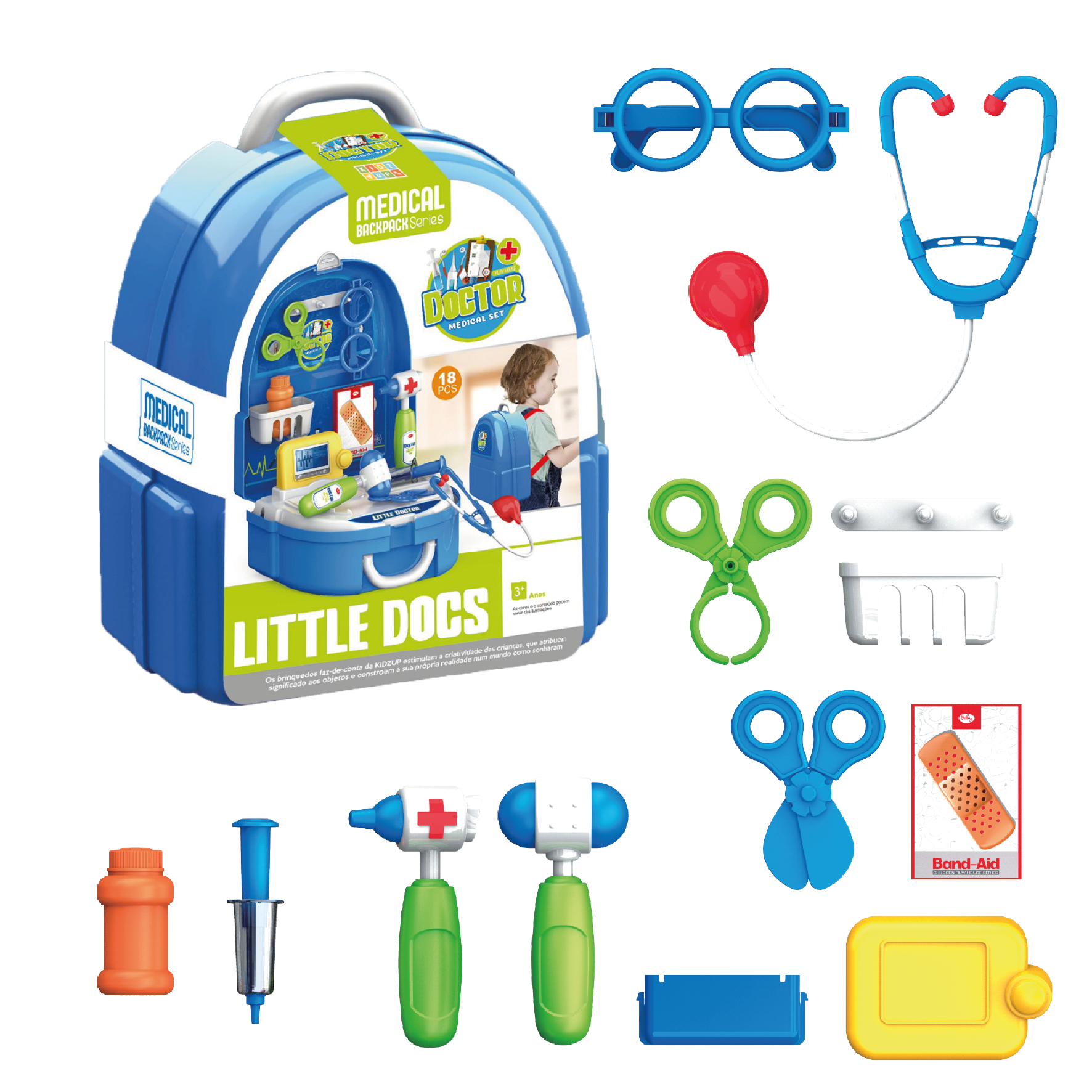 A saúde da diversão está garantida! Com a Mochila Pequeno Médico 18 peças, as crianças entram no mundo da imaginação e vivem o dia a dia de um verdadeiro doutor. O kit vem completíssimo: estetoscópio, termômetro, seringuinha, curativos, óculos e muito mais — tudo organizado dentro de uma mochila prática e super charmosa!