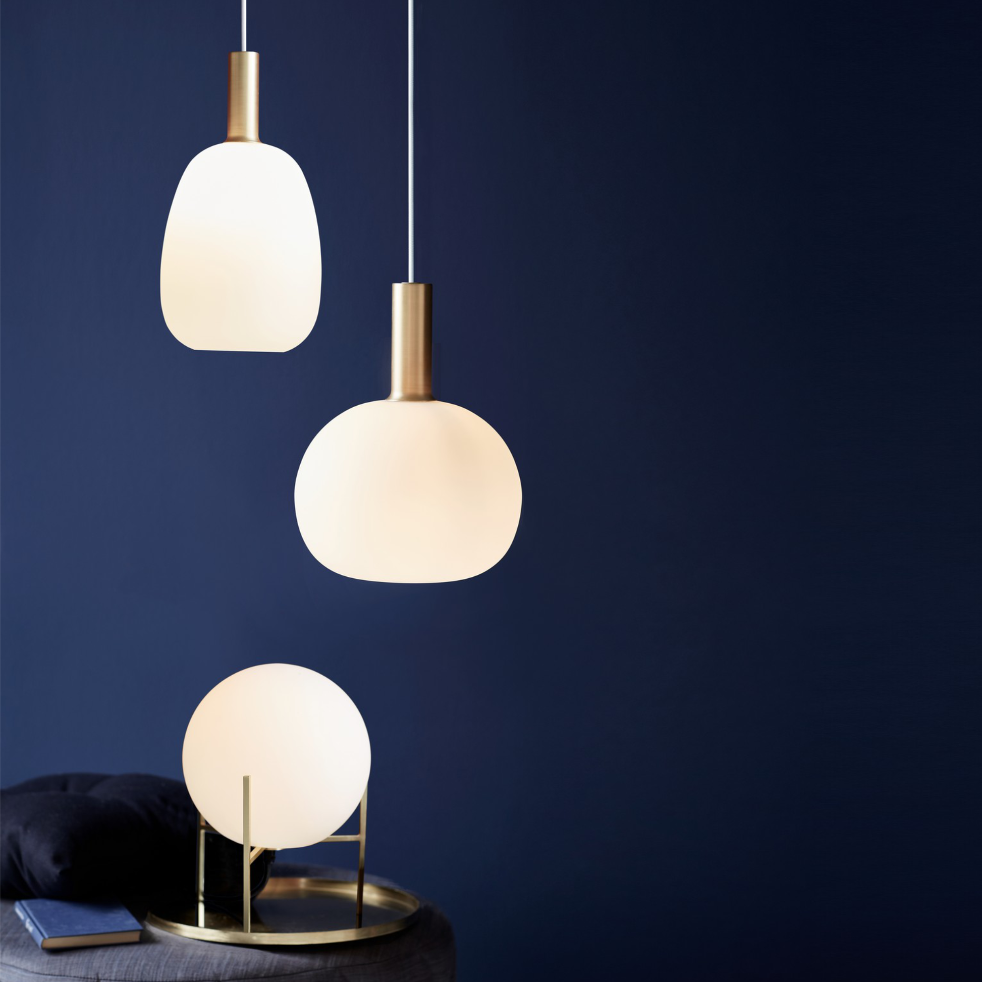 O vidro deste candeeiro é soprado à boca e trabalhado artesanalmente de forma individual. Devido a este processo único, podem surgir pequenas bolhas de ar no vidro e a espessura pode variar. Isto confere ao vidro o seu carácter e um aspeto vivo e distinto.