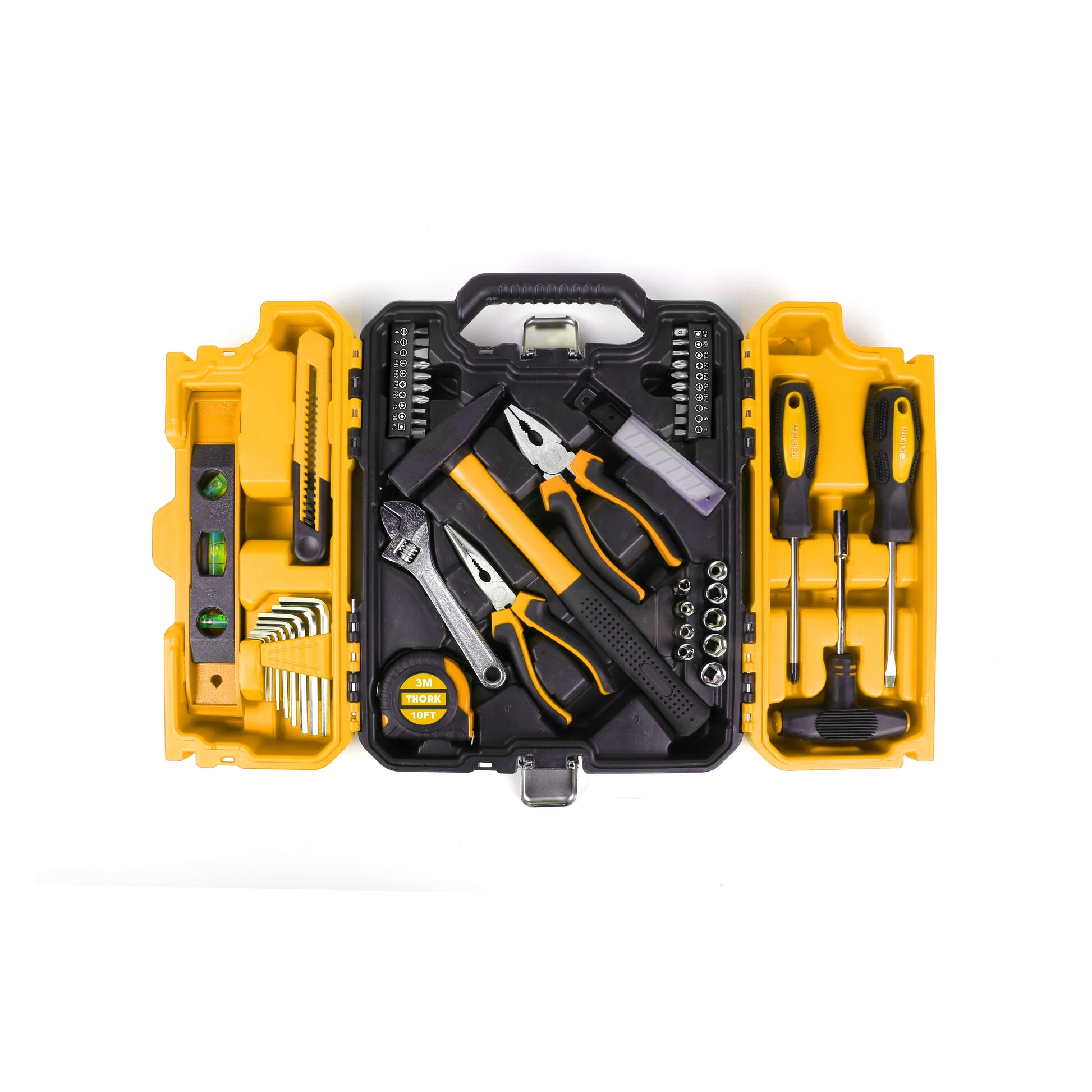Tudo o que precisa para o dia a dia num único conjunto: o kit de ferramentas THORK com 57 peças é a solução ideal para reparações, manutenção e bricolage. Pensado para oferecer praticidade e eficiência, reúne as ferramentas essenciais para qualquer tipo de trabalho, seja em casa, na garagem ou no local de trabalho.