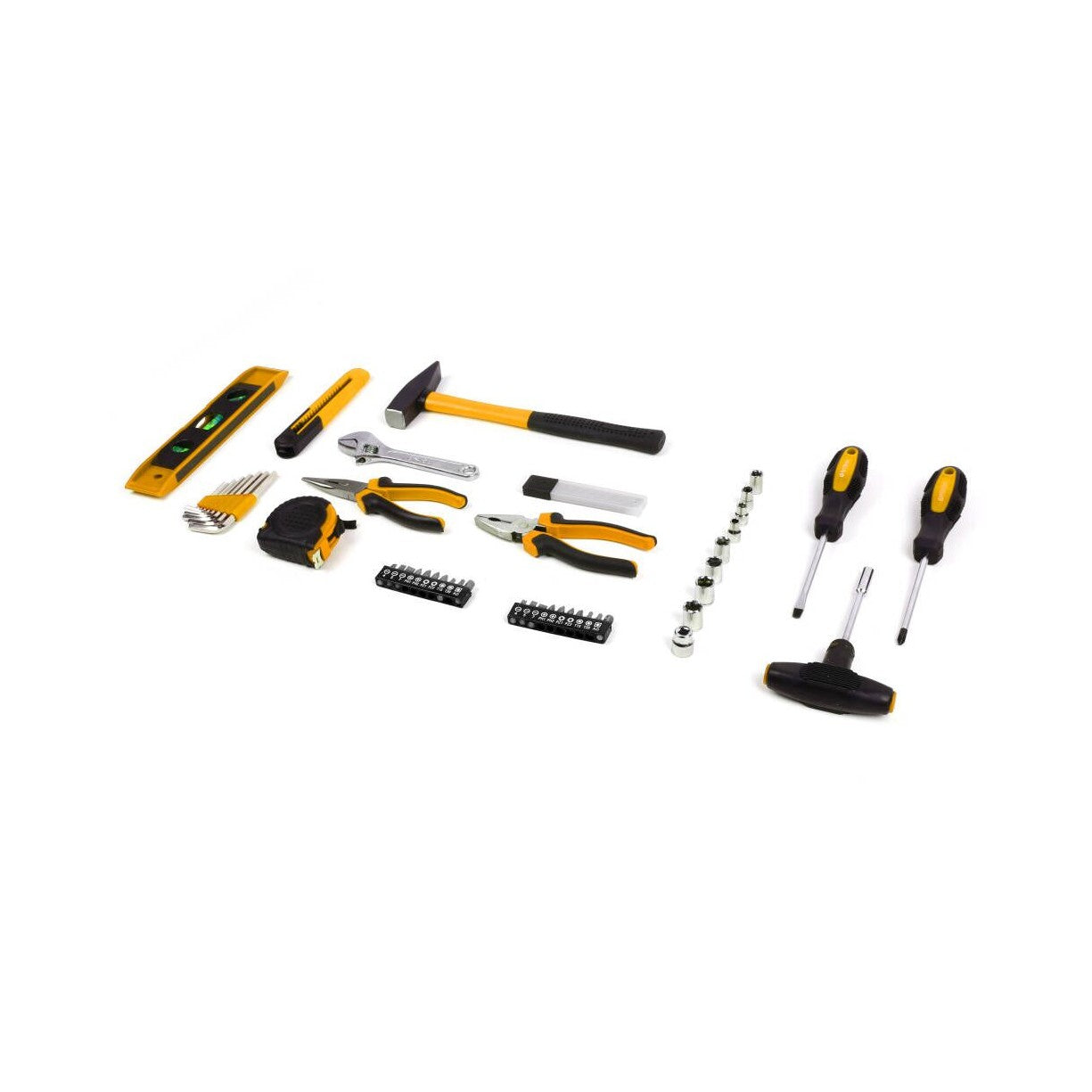 Inclui uma seleção completa com nível, fita métrica de 3 metros, martelo, alicates, chave inglesa, chaves de fendas, soquetes e muito mais. Cada ferramenta foi escolhida para garantir versatilidade e utilidade em diversas situações, permitindo executar tarefas com precisão e confiança.