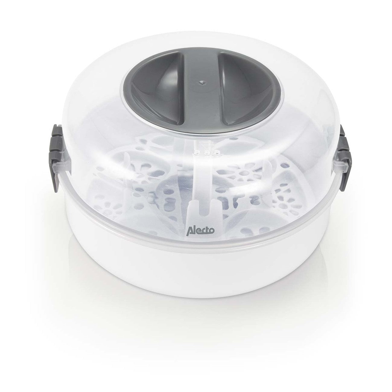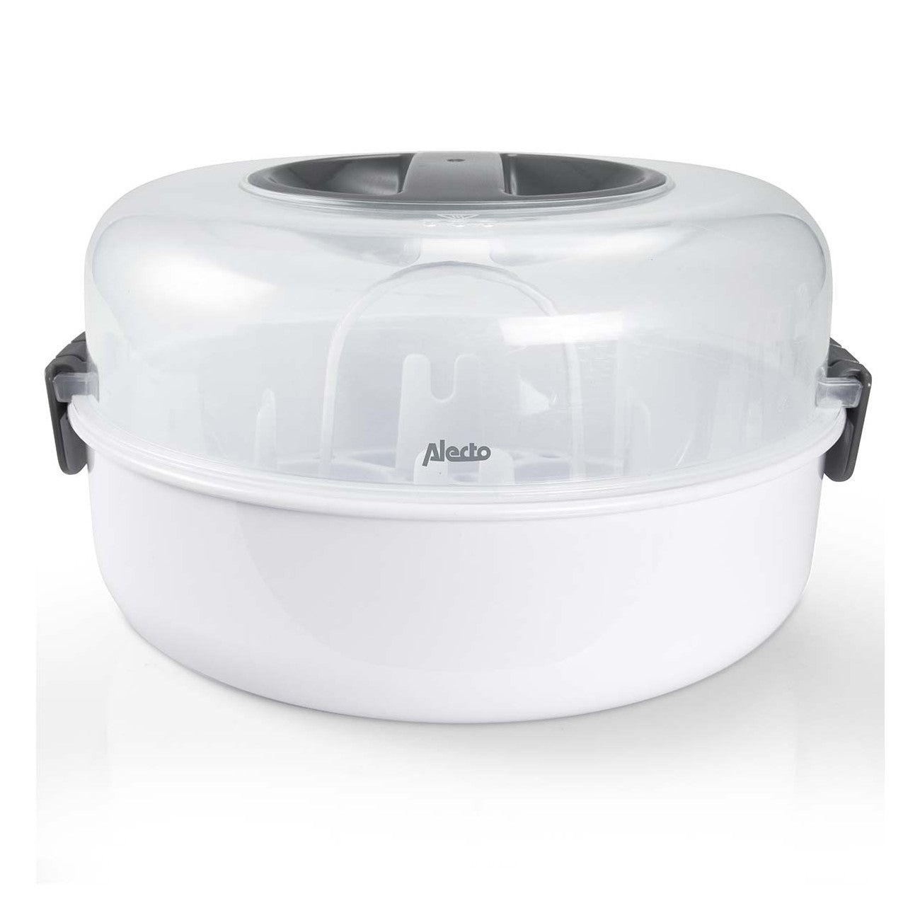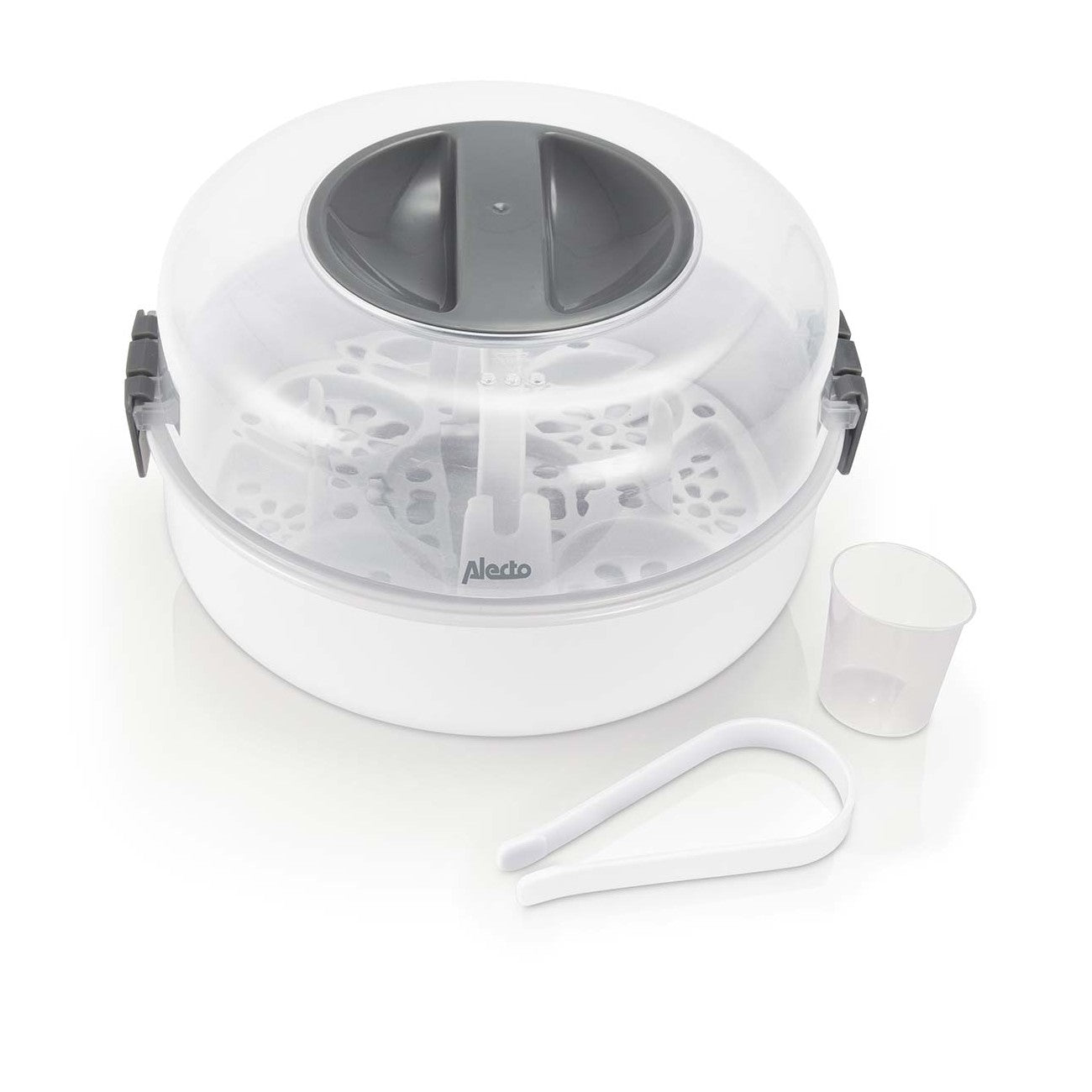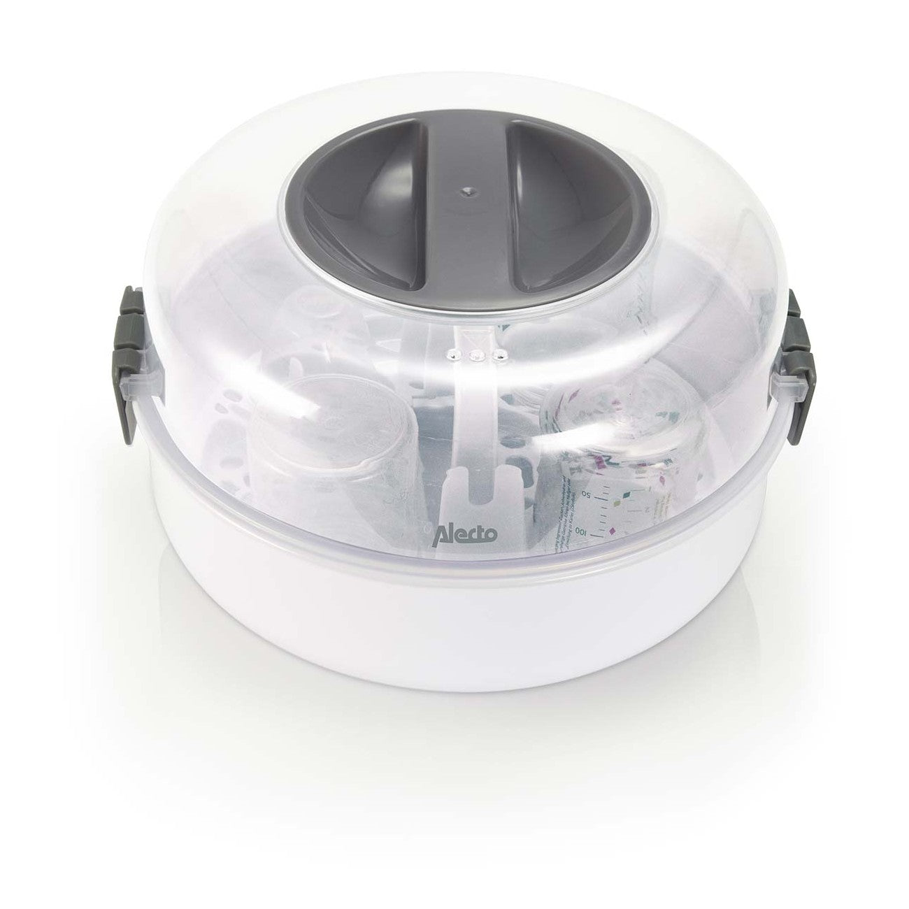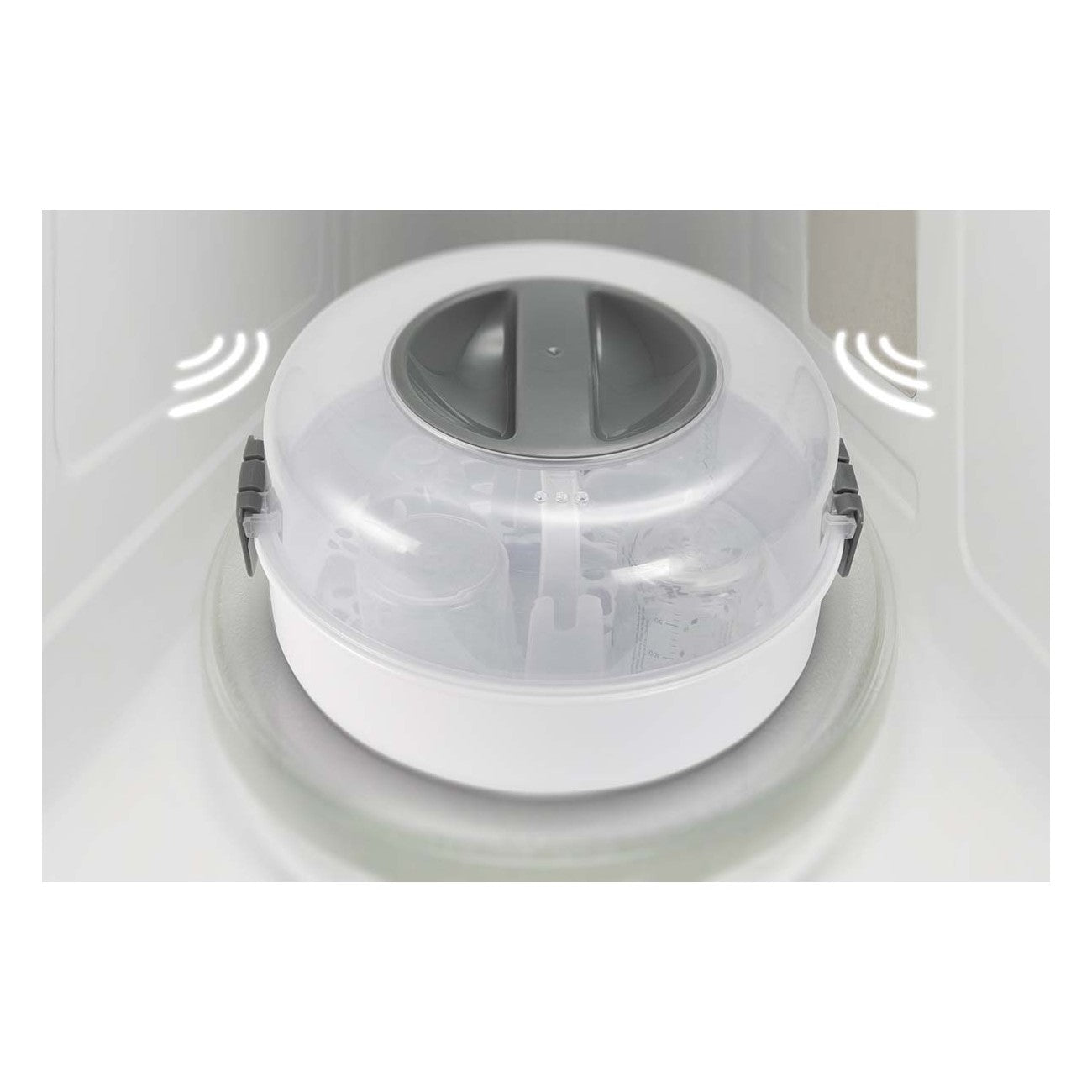 Depois da esterilização, os biberões podem manter-se estéreis até 24 horas, desde que a tampa permaneça fechada. O esterilizador tem capacidade para até quatro biberões de 150 ml em simultâneo e adapta-se a qualquer micro-ondas convencional.