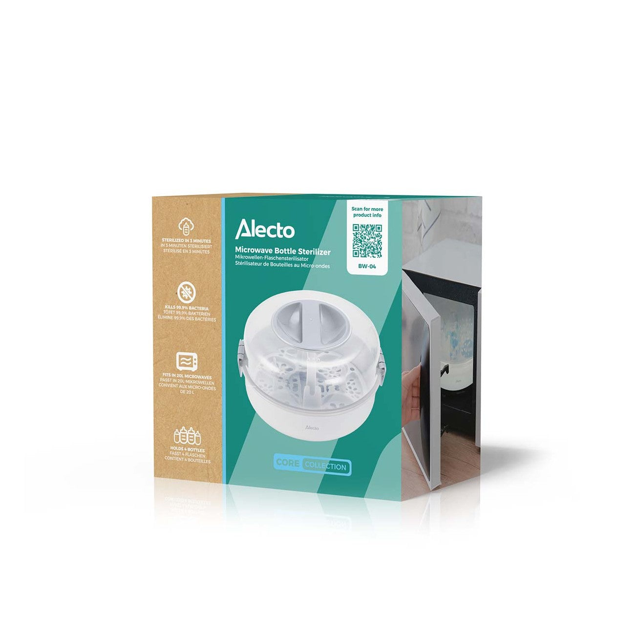 O BW-04 é um recipiente leve e resistente, com tampa. Basta enxaguar os biberões e tetinas, colocá-los virados para baixo no interior e adicionar 120 ml de água da torneira no fundo do recipiente. Após fechar a tampa, coloque-o no micro-ondas à potência máxima durante seis minutos. O processo é rápido, seguro e eficaz.